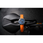 Ce chronographe à quartz polyvalent doté d'un cadran bleu et d'une échelle tachymétrique est inspiré des plus prestigieux circuits automobiles. Fabriqué uniquement à partir de matériaux extrêmement résistants : du verre saphir inrayable au bracelet en caoutchouc orange. Disponible en ligne exclusivement.