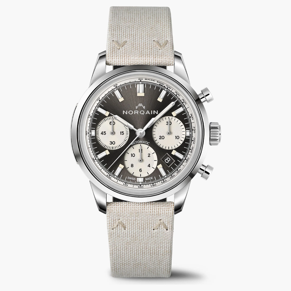 Plaquette NORQAIN gravée en acier inoxydable 316L sur le côté gauche du boîtier