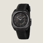Montre en composite de graphène et lunette en céramique satinée soleil avec chanfreins polis miroir, minuterie décalquée gris, mouvement de Manufacture Hermès H1837, cadran traité or noir, centre grainé, bracelet en caoutchouc noir