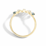 Graphic contrasts Three sky topazes and two London blues, all baguette-cut, create a play of volumes and reflections on 9K yellow gold. A balance of precision and brilliance, also perfect when paired with the two solitaire rings.