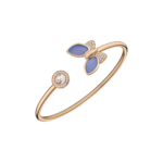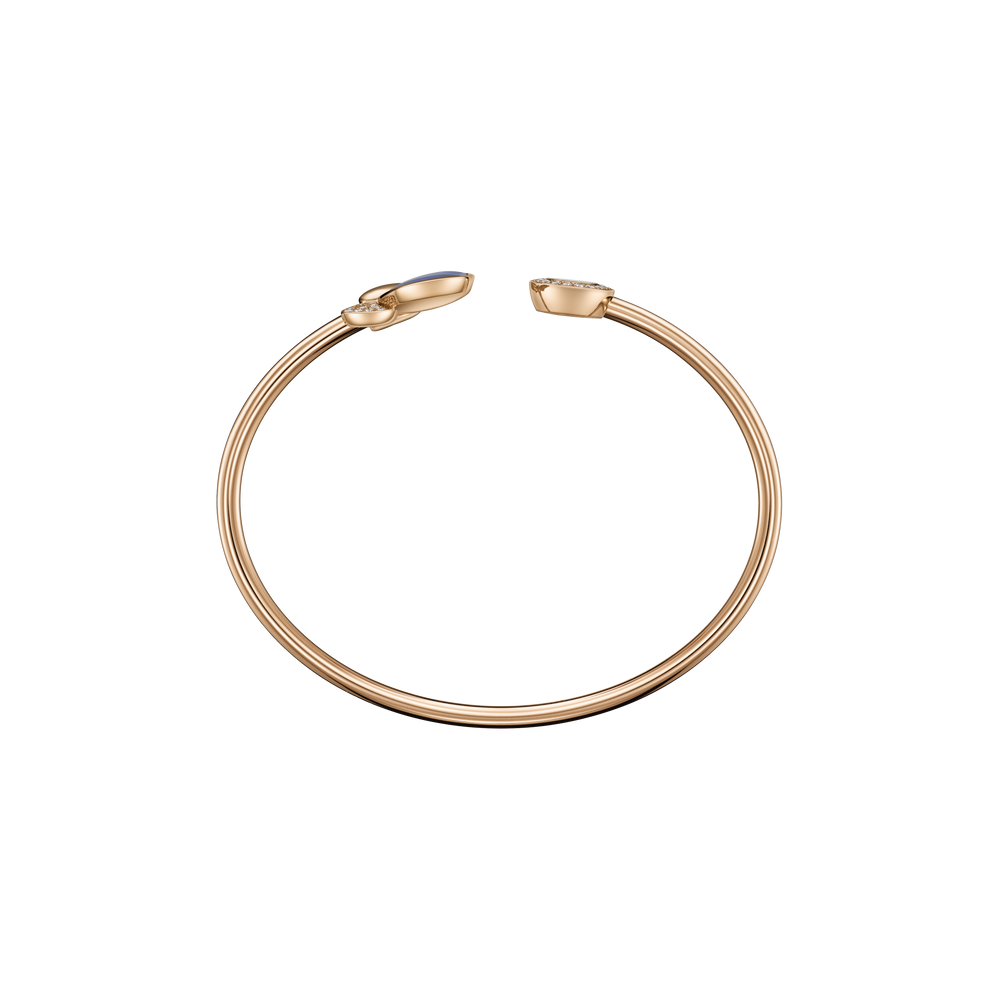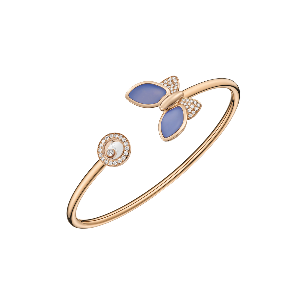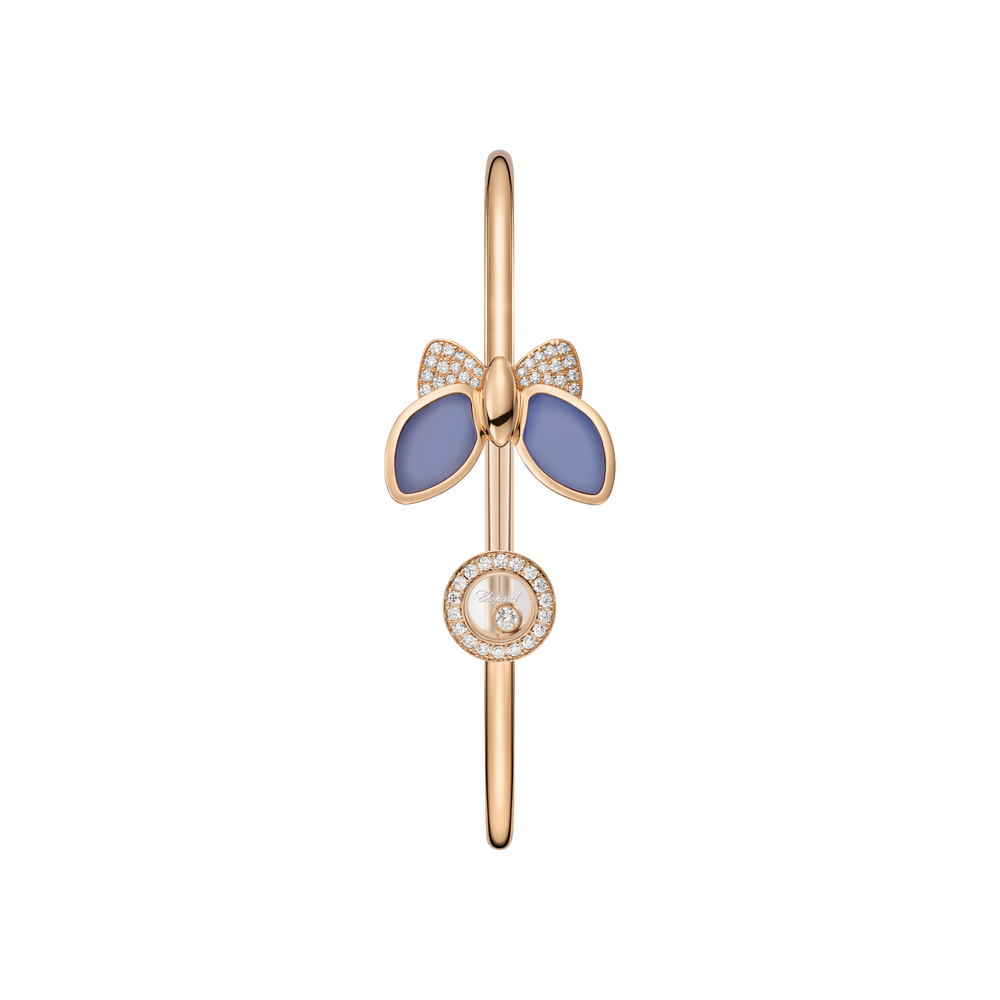 Courbes douces, rondes Symboles universels Diamants mobiles Dans la pure tradition des créations Happy Diamonds, voici un petit animal porte-bonheur. Un papillon en or rose éthique 18 carats, interprété avec une grande tendresse et conçu pour être porté comme un bracelet jonc. Little Diamonds Do Great Things