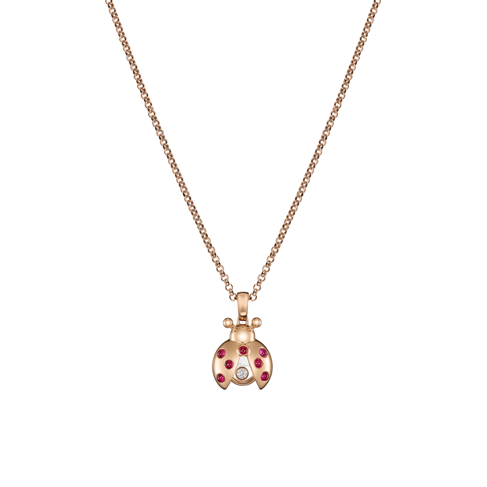 Courbes douces, rondes Symboles universels Diamants mobiles Dans la pure tradition des créations Happy Diamonds, voici un petit animal porte-bonheur. Une coccinelle en or rose éthique 18 carats, interprétée avec une grande tendresse et conçue pour être portée comme un pendentif, près du cœur. Little Diamonds Do Great Things