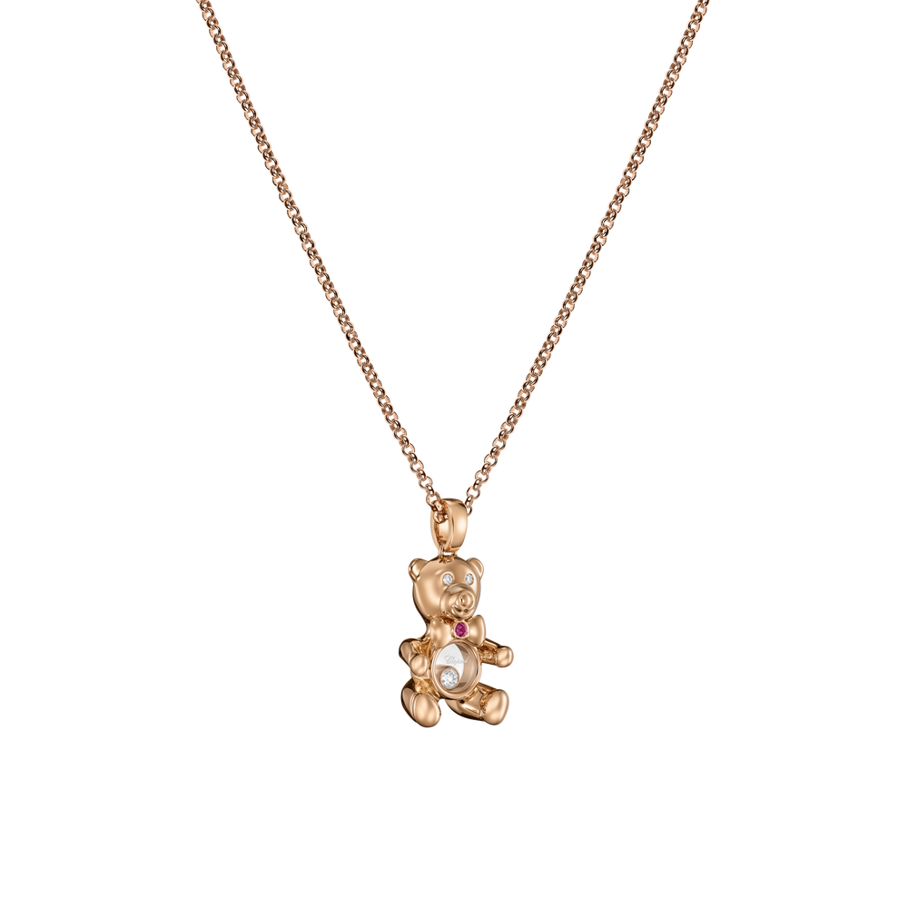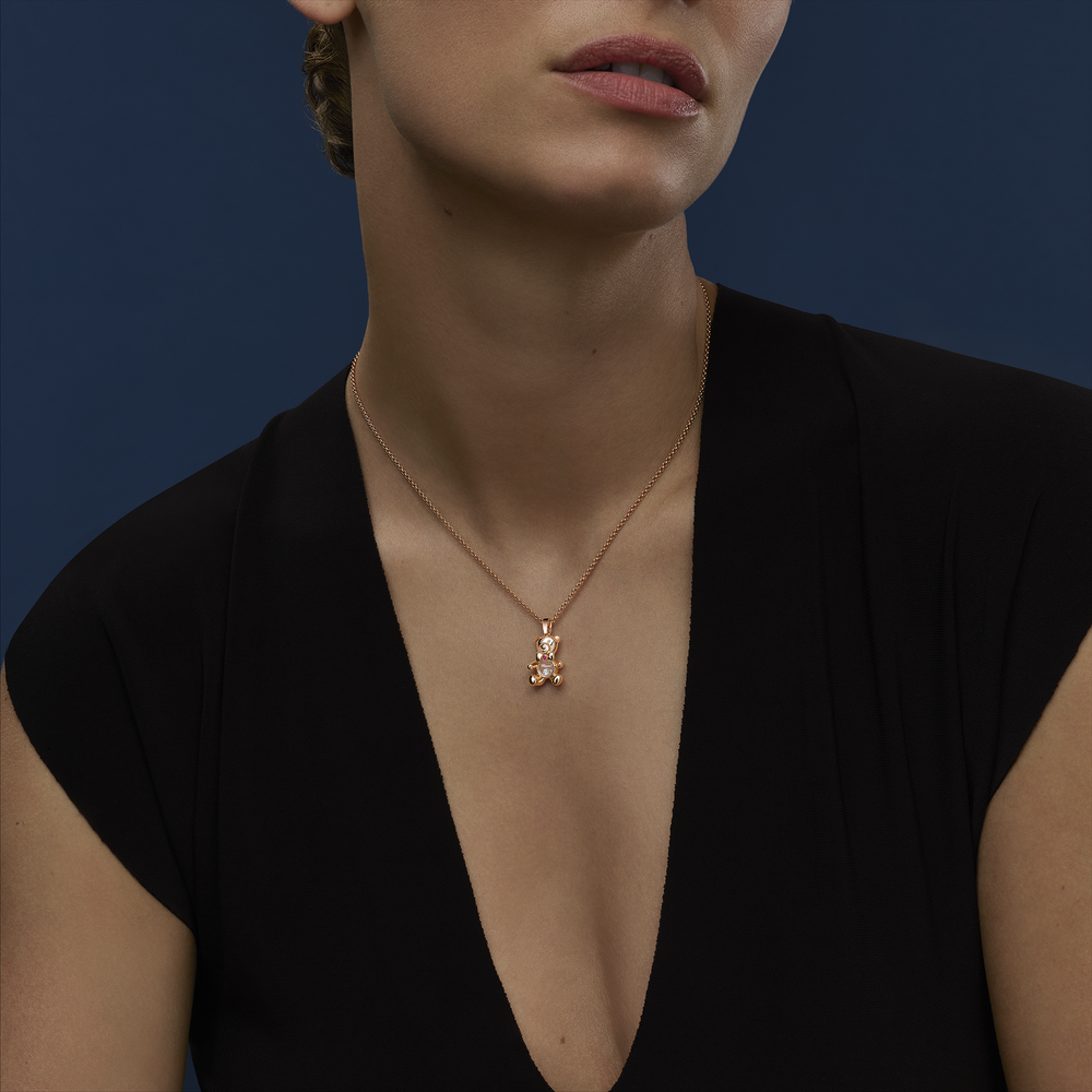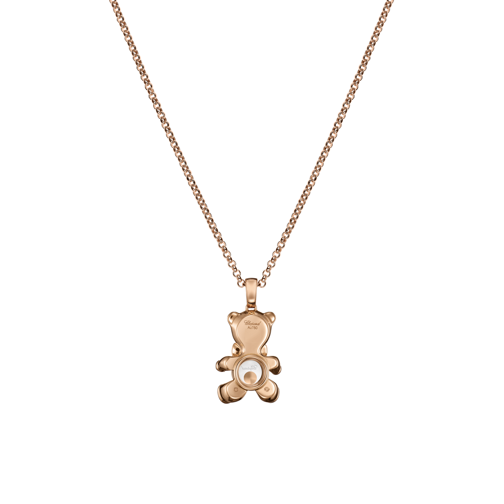 Courbes douces, rondes Symboles universels Diamants mobiles Dans la pure tradition des créations Happy Diamonds, voici un petit animal porte-bonheur. Un ourson en or rose éthique 18 carats, interprété avec une grande tendresse et conçu pour être porté comme un pendentif, près du cœur. Little Diamonds Do Great Things
