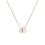 Le papillon, emblème par excellence de légèreté, a soufflé aux colliers en diamant Happy Hearts Wings toute sa délicatesse et sa force symbolique. Il trouve dans les lignes de cette collection de bijoux de luxe un aboutissement d’un grand raffinement, en résonance avec les symboles de la Maison Chopard. Deux cœurs en nacre et or rose, disposés comme des ailes de papillon, sont suspendus à un cœur dans lequel se love un diamant mobile. Little Diamonds Do Great Things