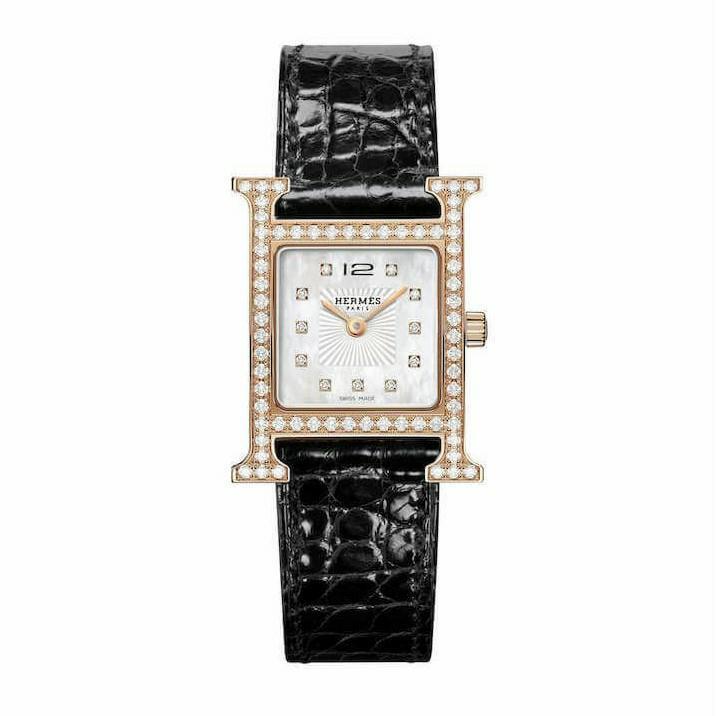 Hermès Heure H Petit Modèle, mouvement quartz, boitier or rose 750 serti de 75 brillants total 0.96ct, étanche 30M, verre saphir, bracelet cuir vernis, boucle ardillon