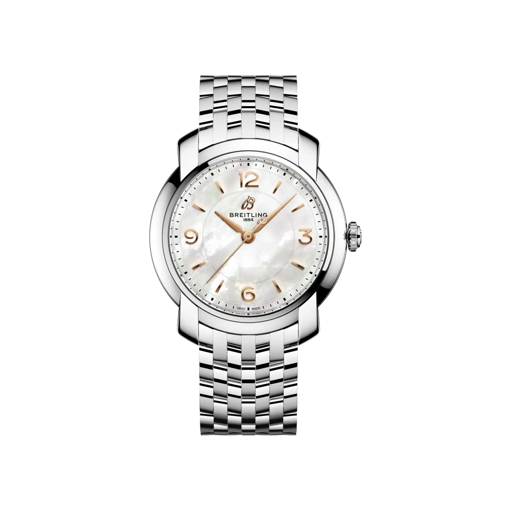 Aujourd’hui, Breitling remet cette élégance inédite au goût du jour avec la nouvelle Lady Premier. Avec ses silhouettes sculptées, ses nuances lumineuses et ses diamants en cascade, son design est aussi spontané qu’élégant. Des chiffres minimalistes, des aiguilles en losange et une couronne sculpturale finissent de sublimer ce véritable bijou. Les modèles de 32 mm sont pourvus d’un bracelet Chevron à sept rangées effilées (un clin d’œil tout en féminité à la Premier pour homme), associé à la précision du mouvement Calibre 77 SuperQuartz™ certifié COSC. Lady Premier célèbre les femmes naturelles, qui traversent la vie avec confiance et une touche d’humour.