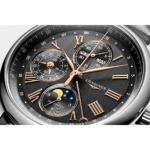 Fonctions du chronographe : Mécanisme du chronographe : aiguille centrale 60 secondes, compteur 12 heures avec affichage des phases de la lune 6h, compteur 30 minutes avec affichage du jour et du mois à 12h