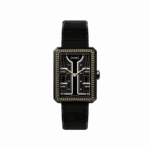 Moyen modèle, acier avec revêtement noir et chaîne en or jaune 18 carats intégrée dans la lunette, bracelet interchangeable en cuir de veau noir motif ruban gros grain, doublure dorée