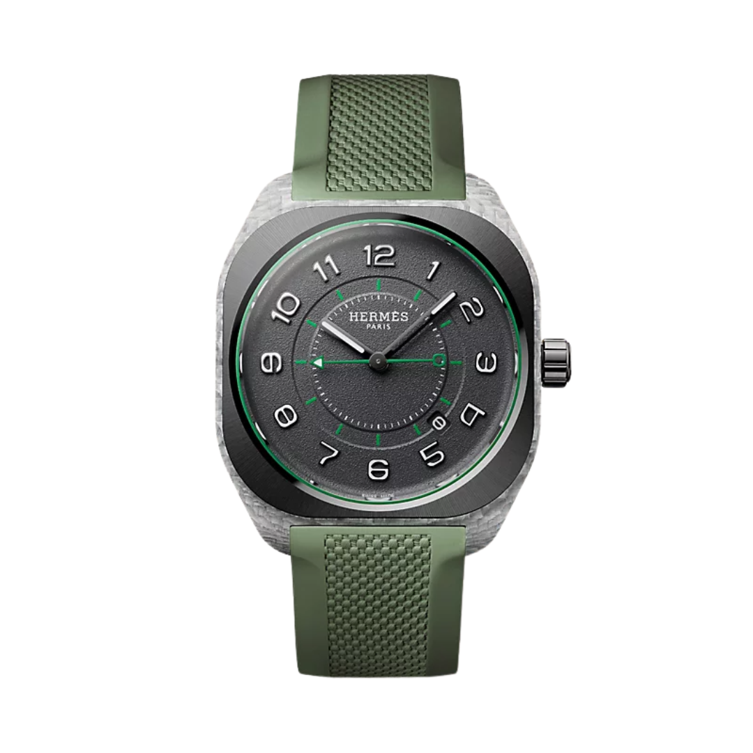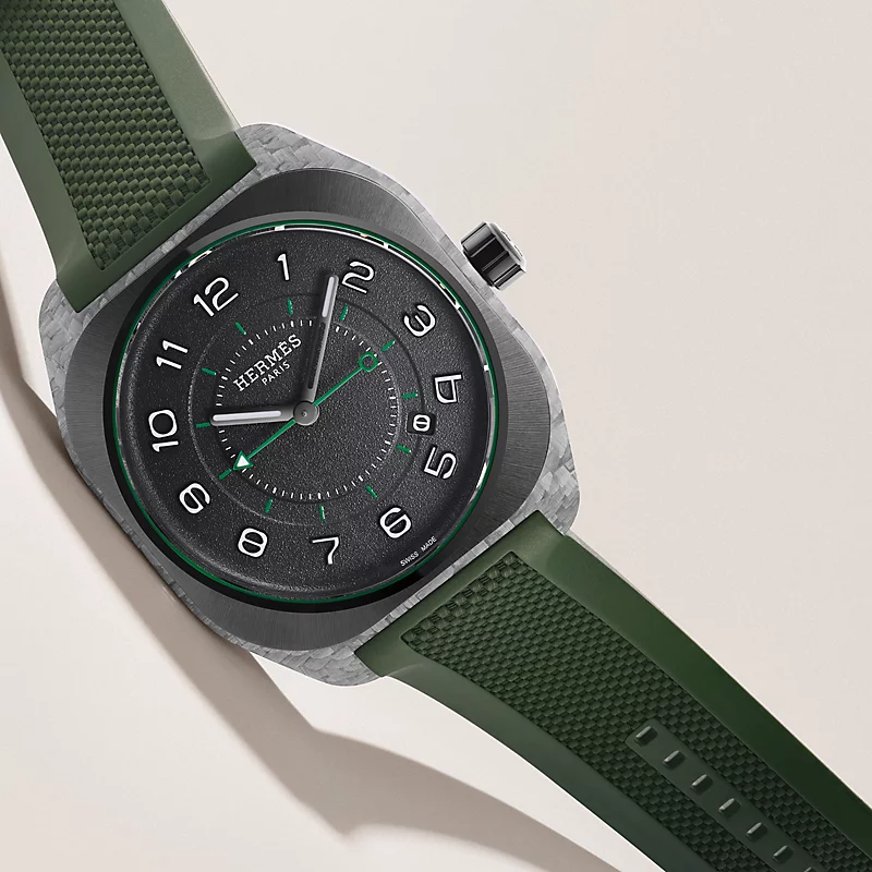 Montre en composite de fibre de verre tressée et métallisée en surface d'aluminium et de poudre d'ardoise, lunette en céramique noire satinée soleil avec chanfreins polis miroir, mouvement de Manufacture Hermès H1837, cadran couleur béton verni et grainé, bracelet en caoutchouc vert