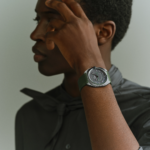 Cadran couleur béton verni et grainé, chiffres arabes en applique rhodiés recouverts de Super-LumiNova®, aiguilles recouvertes de Super-LumiNova®