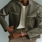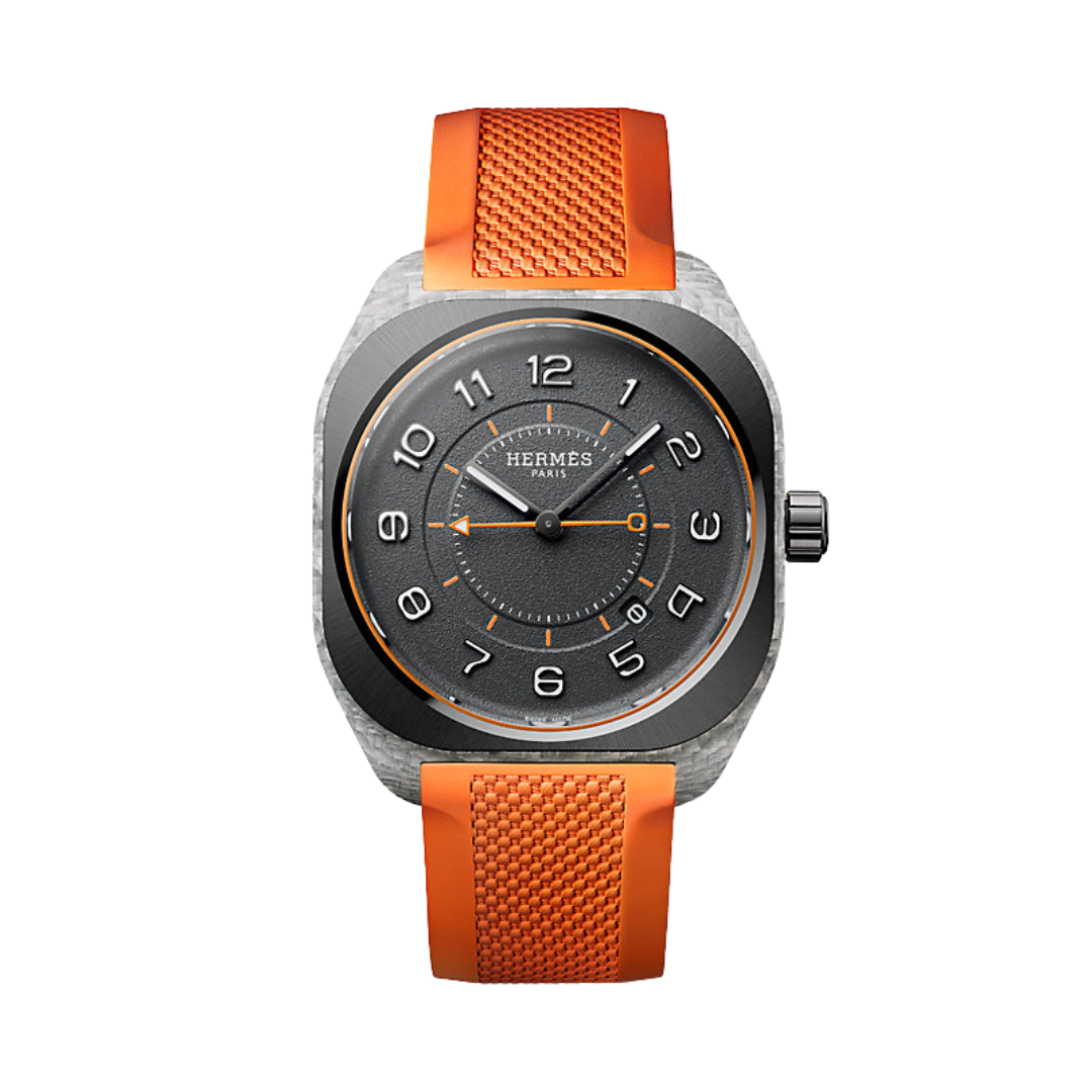 Montre en composite de fibre de verre tressée et métallisée en surface d'aluminium et de poudre d'ardoise, lunette en céramique noire satinée soleil avec chanfreins polis miroir, mouvement de Manufacture Hermès H1837, cadran couleur béton verni et grainé, bracelet en caoutchouc orange