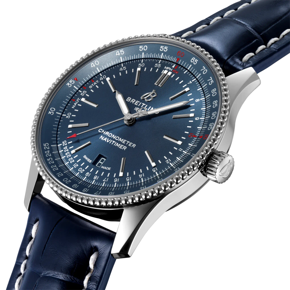 Disponible dans un large éventail de matières, acier inoxydable et or rouge 18 carats inclus, le boîtier de 41 mm est équipé d’une lunette perlée et d’un éventail d’élégants cadrans noirs, anthracites, bleus ou argent. Proposée avec un bracelet correspondant, ou avec un bracelet en cuir d’alligator noir, bleu ou marron assorti aussi bien à une boucle ardillon en acier inoxydable que déployante, la Navitimer Automatic 41 est animée par le Calibre Breitling 17, un chronomètre certifié COSC.
