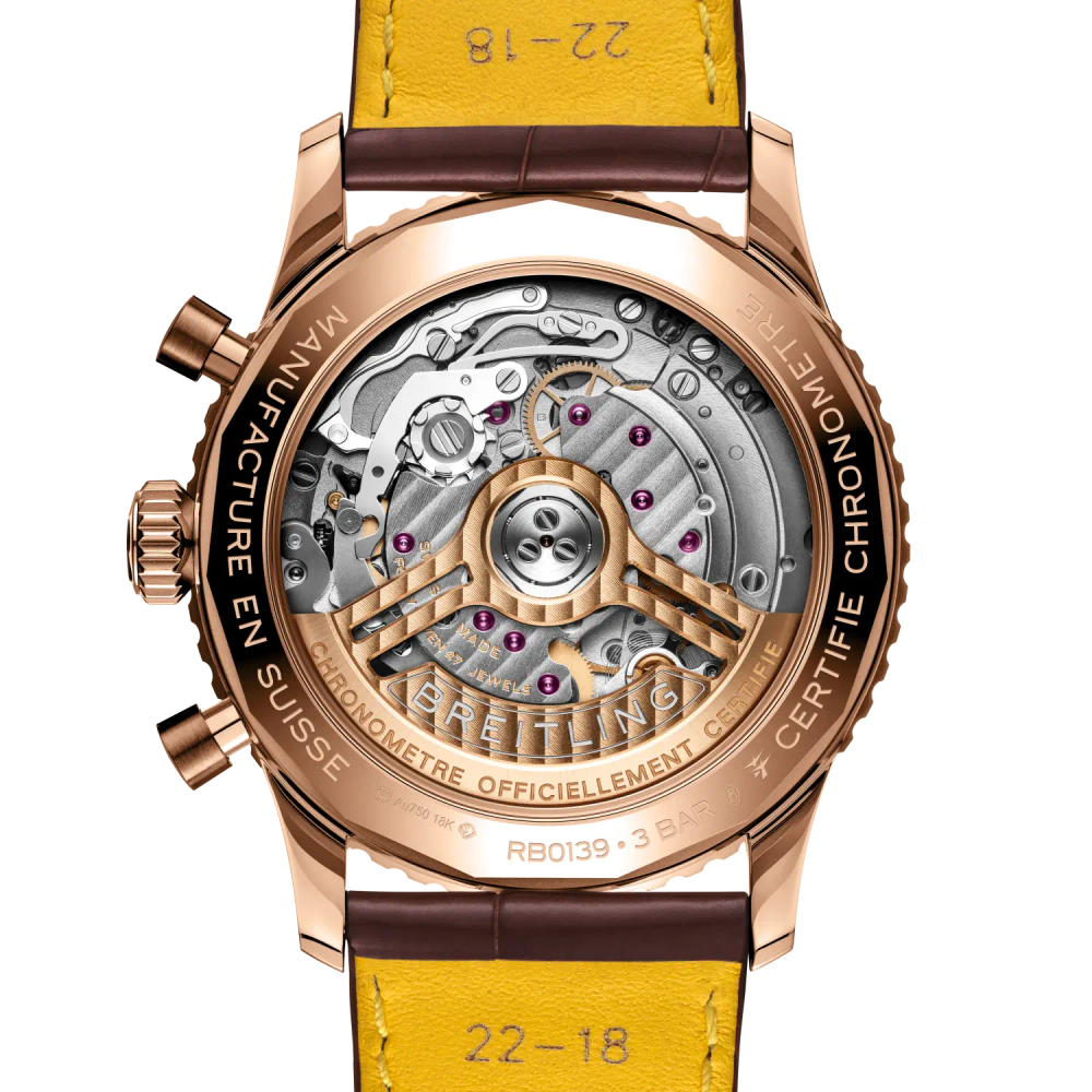 Depuis son lancement 70 ans plus tôt, de nombreux exemplaires de l’icône de Breitling sont apparus, mais cette nouvelle Navitimer reprend ses caractéristiques les plus emblématiques, tout en y apportant quelques retouches modernes. Une règle à calcul aplanie et un verre bombé créent l’illusion d’un profile plus élancé. Alterner des éléments métalliques polis et brossés donne une finition à la fois brillante et sobre. De nouvelles couleurs dans des teintes de bleu, de vert et de cuivre, définissent plus particulièrement les choix de cadrans modernisés. Enfin, s’il y a une nouvelle singularité qui suscite la nostalgie, c’est bien le retour des ailes de l’AOPA sur leur position initiale à 12 heures.