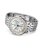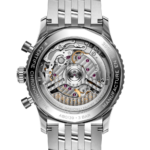 Depuis son lancement 70 ans plus tôt, de nombreux exemplaires de l’icône de Breitling sont apparus, mais cette nouvelle Navitimer reprend ses caractéristiques les plus emblématiques, tout en y apportant quelques retouches modernes. Une règle à calcul aplanie et un verre bombé créent l’illusion d’un profile plus élancé. Alterner des éléments métalliques polis et brossés donne une finition à la fois brillante et sobre. De nouvelles couleurs dans des teintes de bleu, de vert et de cuivre, définissent plus particulièrement les choix de cadrans modernisés. Enfin, s’il y a une nouvelle singularité qui suscite la nostalgie, c’est bien le retour des ailes de l’AOPA sur leur position initiale à 12 heures.