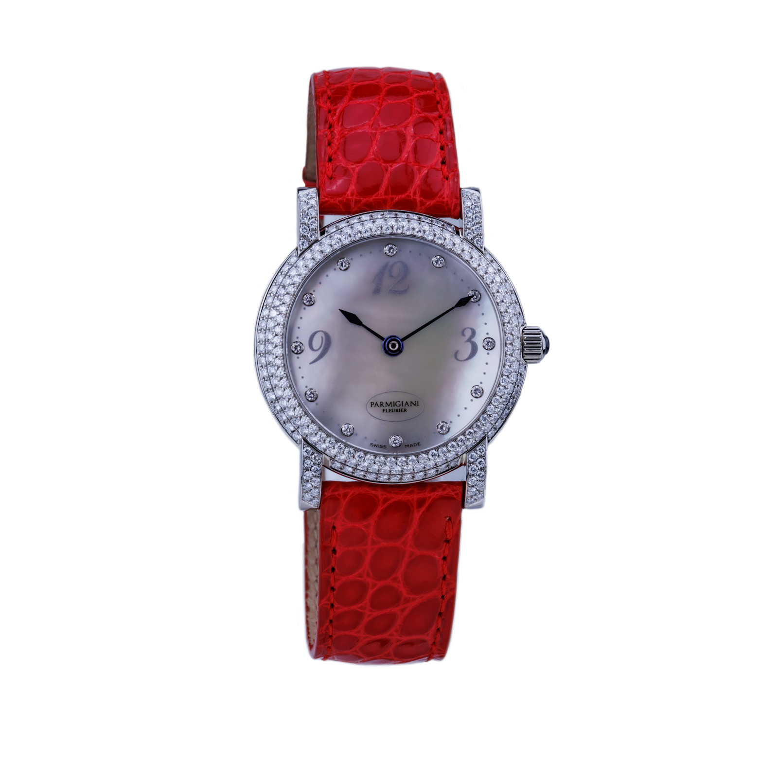 Occasion Parmigiani Basica, mouvement automatique, boitier 32,5mm en or blanc 750, boitier et cornes sertis de diamants, cadran nacre blanche index diamants et chiffres arabes, aiguilles bleuies, verre saphir, bracelet alligator rouge brillant sur boucle ardillon en or blanc sertie. Total diamants 1.80 carats F-VVS.