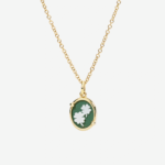 Pendentif Camée en or jaune 9 K et porcelaine blanche et verte avec gravure au dos.