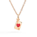 Laissez-vous séduire par le charme de notre pendentif cartes en or rose, un bijou exclusif qui allie style et symbolisme. Le cœur en émail, inspiré de la couleur Cœur, représente l’amour, l’énergie et cette étincelle de chance qui accompagne ceux qui osent.