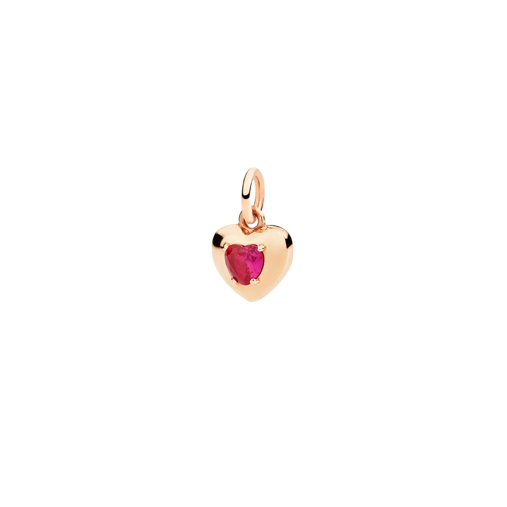 Un cœur qui brille d’essentiel : des surfaces courbes et polies qui captent la lumière comme une émotion. La pierre, un rubis synthétique serti à la main, ajoute une touche d’éclat. Au dos, un espace secret attend votre gravure, transformant le charm en un fragment d’histoire personnelle.