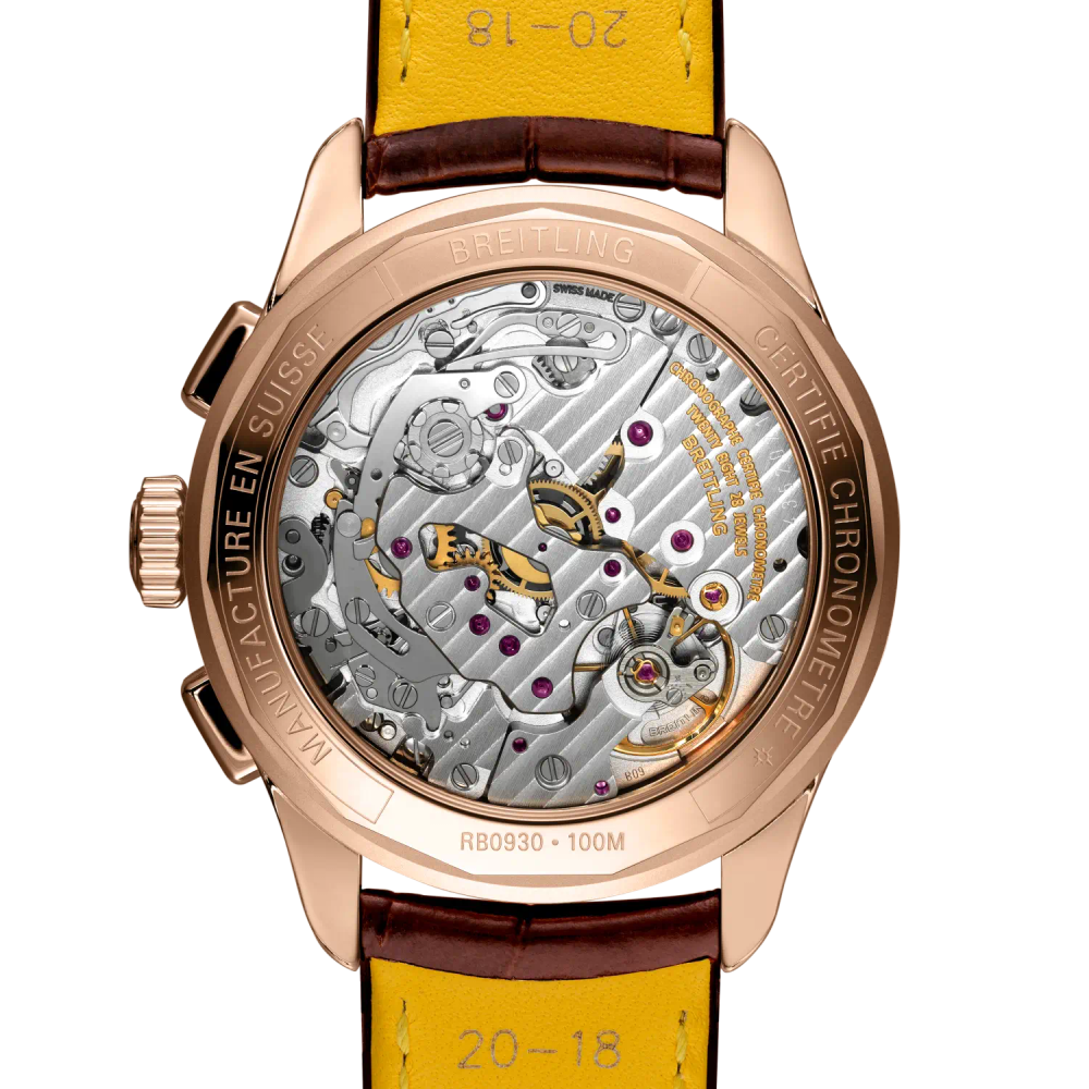 La Chronograph est proposée en deux versions : en acier inoxydable avec un cadran vert pistache et un bracelet en cuir d’alligator brun doré ou en or rouge 18 carats avec un cadran argent et un bracelet en cuir d’alligator brun. La Chronograph est animée par un Calibre manufacture Breitling B09 certifié COSC à remontage manuel.