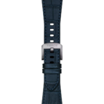 Cette version est dotée d'un cadran bleu brossé soleil avec index et d'un bracelet en cuir bleu avec une boucle standard.