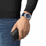 Cette version de la Tissot PRX Powermatic 80 a un cadran bleu avec des index et un bracelet en cuir bleu avec une boucle ardillon.