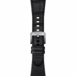 Cette version de la Tissot PRX Powermatic 80 a un cadran noir avec des index et un bracelet en cuir noir avec une boucle ardillon.