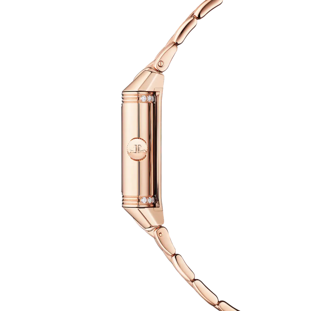 La Reverso Classic Small Duetto, avec son boîtier en or rose 750/1000 18 carats de 34,2 x 21 mm, incarne l’élégance intemporelle de la collection et révèle ses deux cadrans, expressions complémentaires d’une élégance fascinante. Le cadran recto affiche une esthétique sophistiquée, avec logo et index en parfaite harmonie avec les aiguilles et les teintes du boîtier. En faisant pivoter le boîtier, un deuxième cadran plus foncé apparaît, marqué par ses index à double trait et son centre soleillé. Cette montre est animée par le Calibre 844 Manufacture à remontage manuel, qui offre une réserve de marche de 50 heures. Polyvalente et raffinée, cette montre est livrée avec un bracelet en or rose (750/1000) 18 carats et un bracelet en cuir d’alligator taupe.