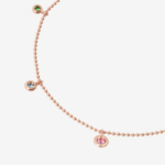 Collier Bollicine en or rose 9 K avec 1 tsavorite (0,02 ct), 1 topaze bleue (0.03 ct), 1 saphir rose (0,08 ct), 1 rubis (0.06 ct) et 1 améthyste (0,04 ct).