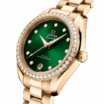 Son cadran laqué vert et soleillé arbore un guichet de date circulaire à 6 heures et 11 index sertis de diamants. Les aiguilles facettées redessinées, dont celle des minutes à la pointe délicatement affinée, sont façonnées en or jaune 18K et traitées en PVD or Moonshine™ tandis que l’ensemble des éléments appliqués est en or Moonshine™ 18K. Les aiguilles sont également revêtues de Super-LumiNova blanc émettant une lueur bleue.