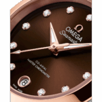 Son cadran laqué brun, soleillé et traité en PVD, arbore un guichet de date circulaire à 6 heures et 11 index sertis de diamants. Les aiguilles facettées redessinées, dont celle des minutes à la pointe délicatement affinée, ainsi que l’ensemble des éléments appliqués sont façonnés en or Sedna™ 18K. Les aiguilles sont également revêtues de Super-LumiNova blanc émettant une lueur bleue.