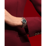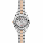 Ce modèle de 30 mm est doté d’un boîtier symétrique poli en acier inoxydable et or Sedna™ 18K, et d’un fond de boîte vissé à bords ondulés.