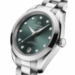 Son cadran laqué soleillé vert sapin arbore un guichet de date circulaire à 6 heures et 11 index sertis de diamants. Les aiguilles facettées redessinées, dont celle des minutes à la pointe délicatement affinée, ainsi que l’ensemble des éléments appliqués sont façonnés en or blanc 18K. Les aiguilles sont également revêtues de Super-LumiNova blanc émettant une lueur bleue.