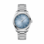 Le cadran soleillé, dans le bleu estival exclusif d’OMEGA, est revêtu en PVD et verni avec une finition dégradée reflétant le niveau d'étanchéité de la montre. Elle possède des aiguilles rhodiées et des index en forme de coque de bateau revêtus de Super-Luminova bleu clair, ainsi qu'un guichet de date bleu assorti à 6 heures.
