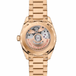 Ce modèle de 38 mm est doté d'un boîtier symétrique en or Moonshine™ 18K et d'un fond de boîte vissé orné d'un motif alvéolé.