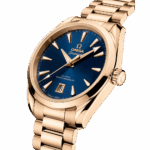 Son cadran soleillé bleu traité en PVD est orné d'un logo OMEGA en or Moonshine™ 18K et d'un guichet de date à 6 heures. Les aiguilles et les index, également en or Moonshine™ 18K, sont revêtus de Super-LumiNova blanc émettant une lueur bleue.