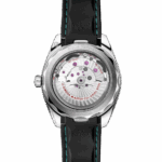 Le cadran turquoise laqué offre une couleur captivante inspirée de l’océan et rehaussée d’un effet dégradé noir, ses aiguilles et index facettés sont revêtus d’un traitement PVD gris et de Super-LumiNova blanc. Le logo OMEGA et le guichet de date sont également traités en PVD gris, assortis aux inscriptions grises en décalque, tandis que la minuterie extérieure arbore la nuance turquoise.