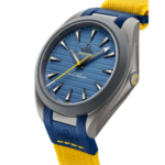 La montre est montée sur un bracelet intégré en caoutchouc et en nylon bleu et jaune. Derrière le fond de boîte en verre saphir, on retrouve le calibre OMEGA Co-Axial Master Chronometer 8928 Ti, qui répond aux critères de précision, de performance et de résistance magnétique les plus élevés de l'industrie horlogère. L'ensemble de la montre est livré dans un écrin spécial.