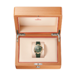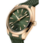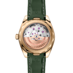 Son cadran vert traité PVD arbore un motif « teck » horizontal évoquant le pont en bois des yachts de luxe, un guichet de date à 6 heures, des aiguilles polies et des index brossés en or Moonshine™ 18K, tous revêtus de Super-LumiNova blanc.