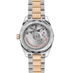 Ce modèle de 34 mm, confectionné en or Moonshine™ 18K et acier inoxydable poli, est doté d’une couronne conique et d'un fond de boîtier verre saphir plat à bords ondulés. Le cadran soleillé et laqué en or Moonshine™ traité PVD arbore un guichet de date circulaire à 6 heures cerclé d'or Moonshine™ 18K. OMEGA a également utilisé l'or Moonshine™ 18K sur ses aiguilles facettées et ses index caractéristiques en forme de coque de bateau et revêtus de Super-LumiNova blanc.
