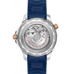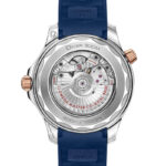 La montre est présentée sur un bracelet en caoutchouc bleu et entraînée par le calibre OMEGA Master Chronometer 8800, que l’on peut admirer à travers le fond en verre saphir à bords ondulés.