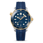 La montre est présentée sur un bracelet en caoutchouc bleu et entraînée par le calibre OMEGA Master Chronometer 8800, que l’on peut admirer à travers le fond en verre saphir à bords ondulés.