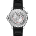 La montre est présentée sur un bracelet en caoutchouc noir intégré. Elle est entraînée par le calibre OMEGA Master Chronometer 8800, que l’on peut admirer à travers le fond en verre saphir à bords ondulés.