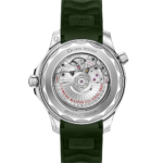 La montre est présentée sur un bracelet en caoutchouc vert et entraînée par le calibre OMEGA Master Chronometer 8800, que l’on peut admirer à travers le fond en verre saphir à bords ondulés.