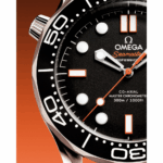 On retrouve l’aluminium noir sur le cadran, orné d’index et d’aiguilles squelettées rhodiés également revêtus de Super-LumiNova blanc. Une touche de couleur orange met en exergue l’aiguille centrale des secondes, les index des quarts d’heure et le nom Seamaster, tandis que le logo OMEGA est réalisé en décalque blanc.