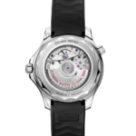La montre est présentée sur un bracelet en caoutchouc noir intégré à boucle déployante. Elle est entraînée par le calibre OMEGA Co-Axial Master Chronometer 8806, que l’on peut admirer à travers le fond en verre saphir.