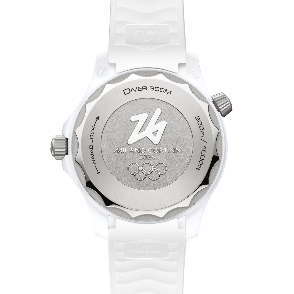 Le fond de boîte en titane grade 5 est estampillé de l’emblème de Milano Cortina 2026, associant à jamais cette montre aux XXVes Jeux Olympiques d’hiver. Animée par le calibre Co-Axial Master Chronometer Calibre 8806, cette montre est montée sur un bracelet en caoutchouc blanc complété par une boucle en titane grade 5.