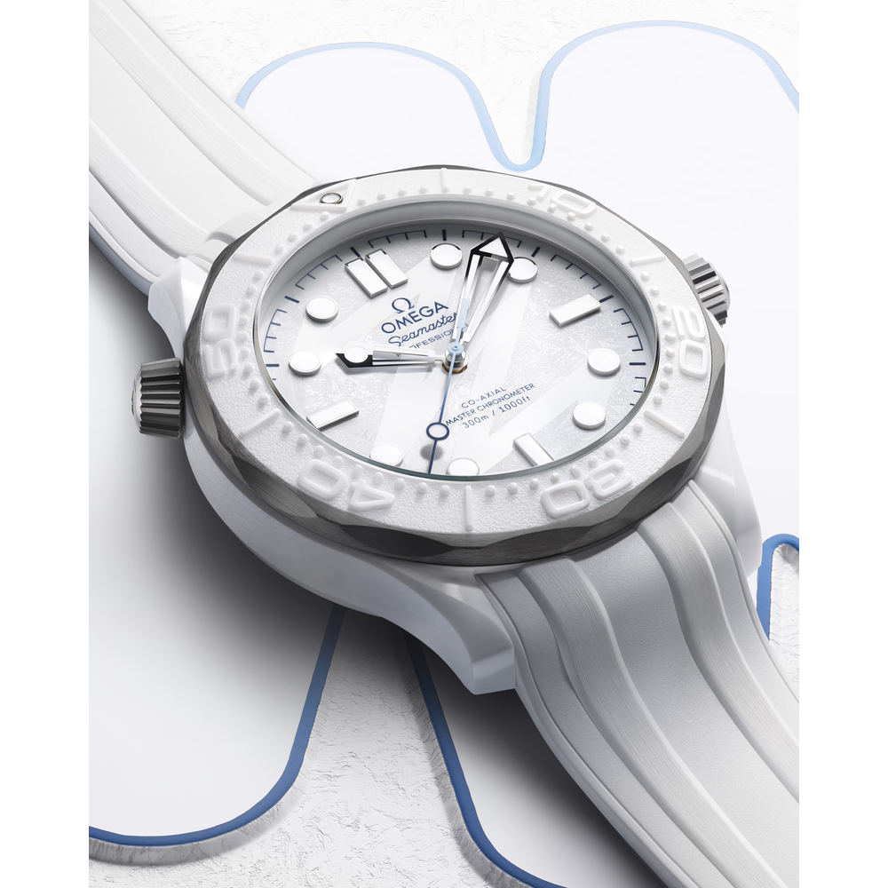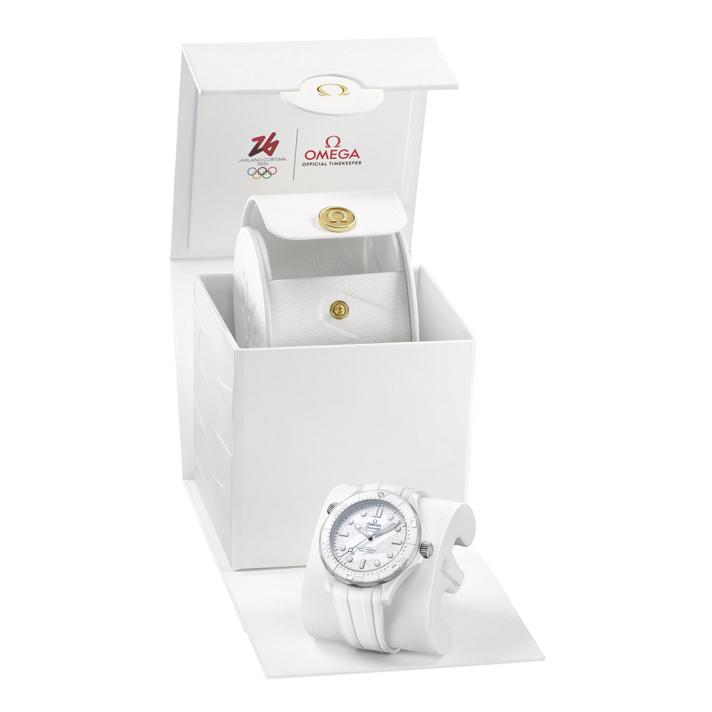 Présentée dans un écrin spécial, cette montre de 43,5 mm est fabriquée en céramique blanche et en titane grade 5. La lunette, également en céramique blanche, est dotée d’une échelle de plongée en relief gravée au laser. Pour créer un look hivernal, le cadran en céramique blanche est orné d’un effet givré gravé au laser et d’un motif trace de doigt inspiré par le « 26 » de l’emblème de Milano Cortina 2026. Pour compléter le design du cadran, les aiguilles et index rhodiés sont revêtus de Super-LumiNova blanc, tandis que l’aiguille centrale des secondes est vernie d’un subtil dégradé de bleu.