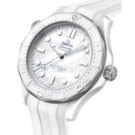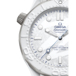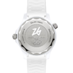 Présentée dans un écrin spécial, cette montre de 43,5 mm est fabriquée en céramique blanche et en titane grade 5. La lunette, également en céramique blanche, est dotée d’une échelle de plongée en relief gravée au laser. Pour créer un look hivernal, le cadran en céramique blanche est orné d’un effet givré gravé au laser et d’un motif trace de doigt inspiré par le « 26 » de l’emblème de Milano Cortina 2026. Pour compléter le design du cadran, les aiguilles et index rhodiés sont revêtus de Super-LumiNova blanc, tandis que l’aiguille centrale des secondes est vernie d’un subtil dégradé de bleu.