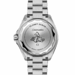 Ce modèle de 42 mm arbore un boîtier en acier inoxydable satiné et poli. Il est doté d’une lunette en céramique bleue polie avec échelle de plongée en émail blanc, tandis que l’anneau intérieur est réalisé en titane grade 5 poli.