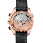 La montre se distingue également par son fond vissé orné au design alvéolaire et son bracelet en cuir noir doublé de caoutchouc.